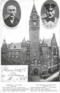�ber die Landesgrenzen hinaus bekannt geworden ist das K�penicker Rathaus nicht durch seine pr�chtige Architektur, sondern durch den Gaunerstreich eines falschen Hauptmannes Anfang des 20. Jahrhunderts. Wilhelm Voigt, der viele Jahre seines Lebens hinter Gittern zugebracht hatte, verhaftete den B�rgermeister Dr. Langerhans und den Kassenrendanten von Wiltburg. Von dem Kassenrendanten Witburg verlangte er einen Kassenabschluss zu machen, denn er habe "die Verwaltung der Stadt �bernommen". Der Kassenbestand betrug laut Kassenbuch 4002 Mark und 37 Pfennigen.Nachdem Wilhelm Voigt eine Ihm vorgelegte Quittung unterschrieben hatt, verschwand er mit 3557 Mark und 45 Pfennigen.