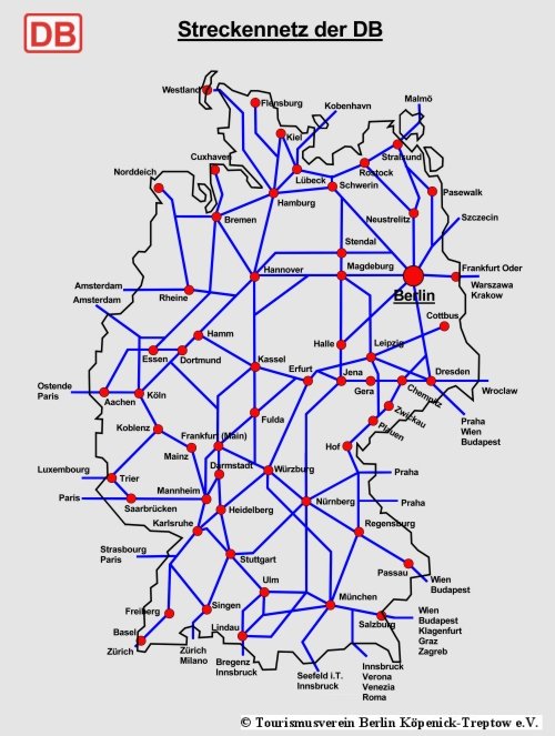 Mit der Bahn nach BerlinBahnreisende nach Berlin kommen haupts�chlich auf den beiden Zentralbahnh�fen Zoologischer Garten und Ostbahnhof an Berlin verf�gt aber �ber vier weitere Fernbahnh�fe in Sch�nefeld, Lichtenberg, Spandau und Wannsee. Alle Bahnh�fe haben direkten Anschluss an U- und S-Bahn und sind Endstation zahlreicher Buslinien. Nutzen Sie auch unseren Link zur BVG!Am Ostbahnhof halten die Z�ge aus Leipzig, Dresden, Prag und Warschau sowie aus anderen St�dten im Osten und S�den. Hier halten fast alle Fernz�ge, wie auch am Bahnhof Zoo. Vom Ostbahnhof, Verkehrsknotenpunkt der �stlichen Innenstadt, erreicht man Berlin - K�penick mit der S-Bahn Richtung Erkner �ber den Umsteige-S-Bahnhof Ostkreuz. Am Bahnhof Lichtenberg enden einige Z�ge aus dem Osten. Mit S-Bahn haben Sie gute Verbindung �ber den Umsteige-S-Bahnhof -Ostkreuz nach Berlin -K�penick. Am s�dlichen Stadtrand liegt der Bahnhof Flughafen Berlin-Sch�nefeld. Hier halten s�mtliche Fern- und Regionalz�ge aus und in Richt | Zur�ck Flugzeug Bahn Auto Boot Bus Tram S-Bahn parken |