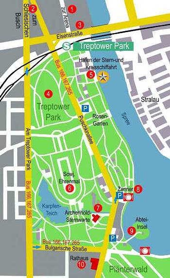 4 Treptower Park. Direkt an der Spree gelegen, ist der Treptower Park mit ca. 160 ha nach dem Tiergarten die zweit-größte öffentliche Parkanlage Berlins. Er wurde 1874 vom Lennè-Schüler und damaligen Gartenbaudirektor Gustav Meyer als "erste betretbare Gartenanlage" für Berlin entworfen. Hier fand 1896 die Berliner Gewerbeausstellung statt.
