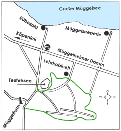 - Köpenick, Müggelheimer Damm, an der Bushaltestelle Rübezahl die einladende Holz-Eingangsgestaltung Teufelssee mit Auto-Stop-Pilz durchwandern, weiter durch hoch gewachsenen Mischwald mit Rastplätzen und Abenteuerspielplatz bis zum Teufelssee